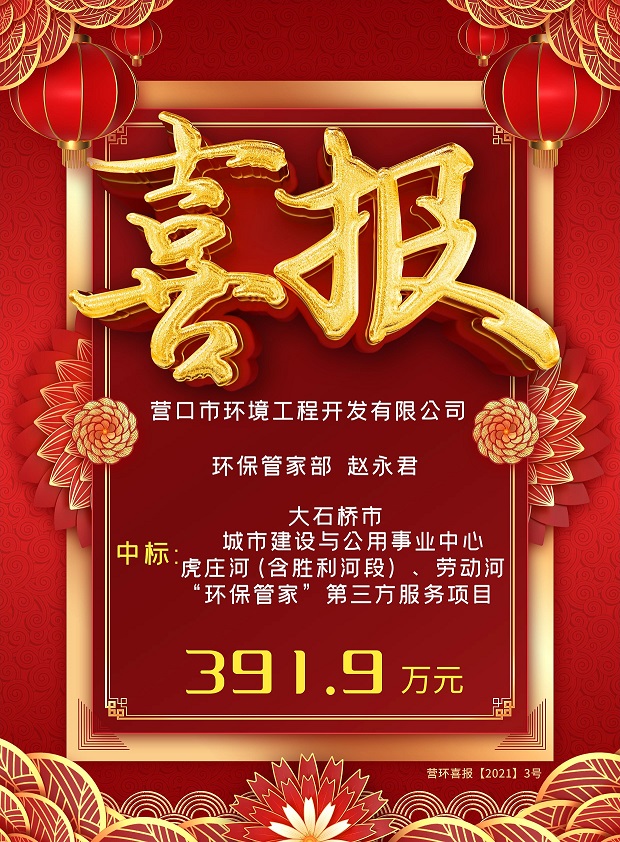 營口市環(huán)境工程開發(fā)有限公司中標(biāo)大石橋市城市建設(shè)與公用事業(yè)中心虎莊河(含勝利河段)、勞動河“環(huán)保管家”第三方服務(wù)項目