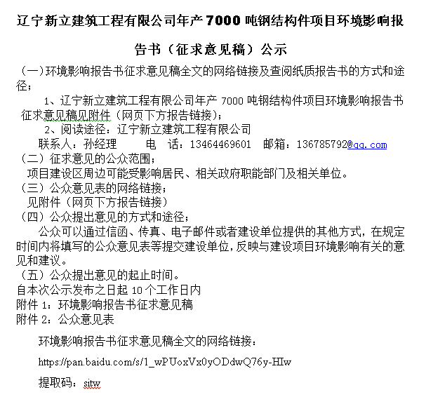 遼寧新立建筑工程有限公司年產(chǎn)7000噸鋼結(jié)構(gòu)件項(xiàng)目環(huán)境影響報(bào)告書(征求意見(jiàn)稿)公示