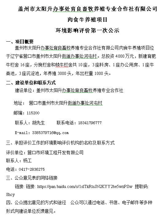 蓋州市太陽升辦事處育良畜牧養(yǎng)殖專業(yè)合作社有限公司 肉食牛養(yǎng)殖項(xiàng)目 環(huán)境影響評價第一次公示